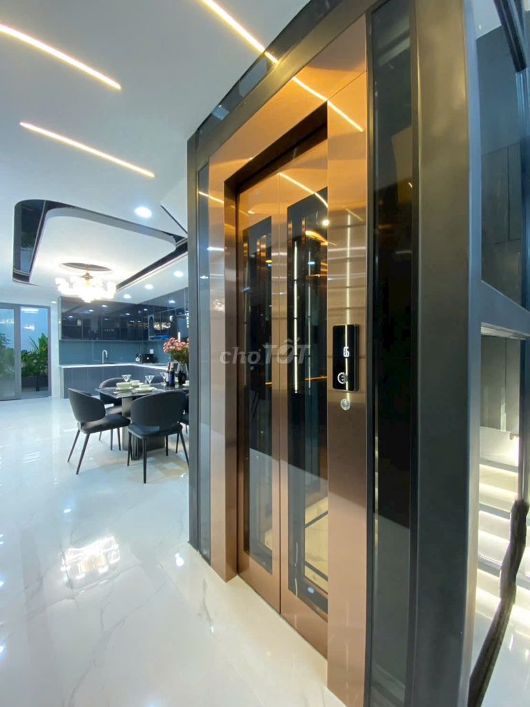 + Thiết kế bắt mắt, sang trọng nhưng vẫn đáp ứng đầy đủ công năng cho gia chủ. Với 5 phòng ngủ và 6 nhà vệ sinh, ngôi nhà rất phù hợp với gia đình nhiều người. Phòng khách có chổ thông tầng cực thoáng mát. Nhà bếp ốp gạch cao đến trần, tủ bếp kệ bếp được lắp đặt sẵn tạo không gian sạch sẽ, gọn gàng. Thang máy được bố trí giữa nhà, với 5 điểm dừng ở mỗi tầng. Phòng thờ được đặt ở phía trước tầng thượng và phía sau là phòng giặt, sân phơi, có sự riêng biệt. Đặc biệt nhà mình có 2 giếng trời để lấy sáng và không khí khắp nhà.