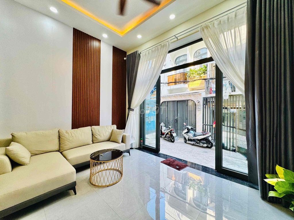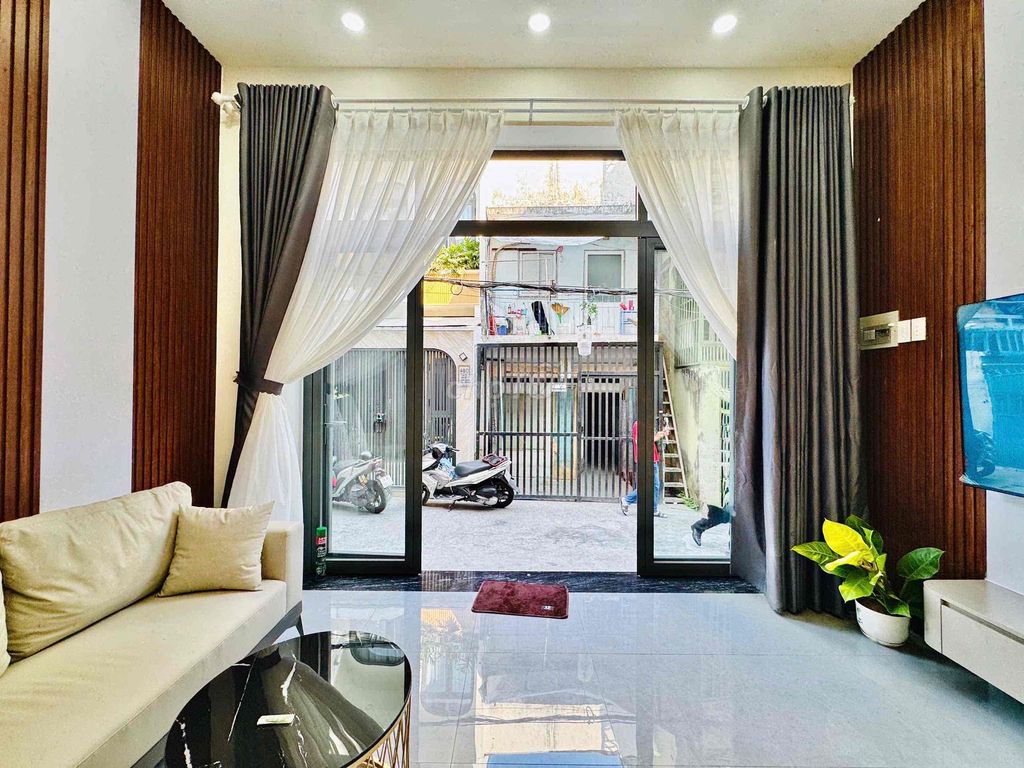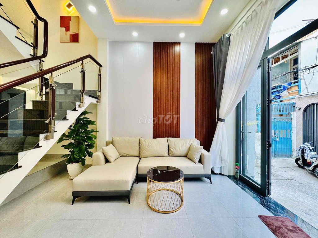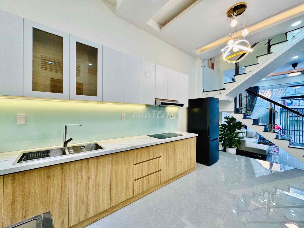 Ngang 4,5m dài 10m, nở hậu tài lộc 5,6m, DTXD 46,7m2, DTSD 190m2 Hẻm trước nhà 5m, hẻm thông