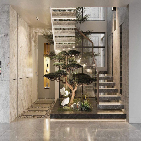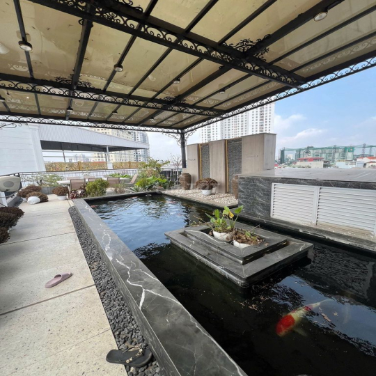 Có bể cá koi, ban công, thác nước, tiểu cảnh.