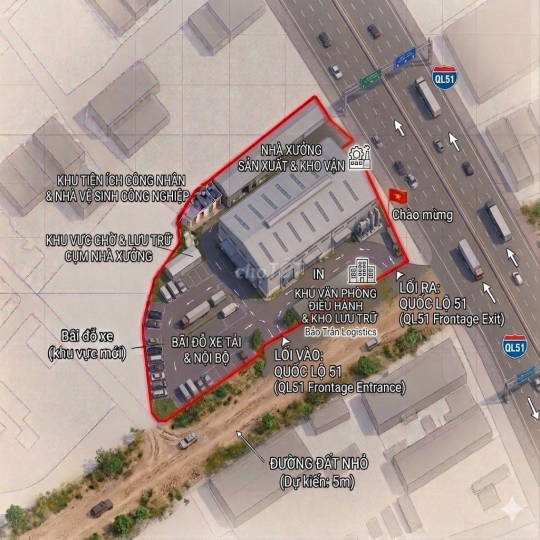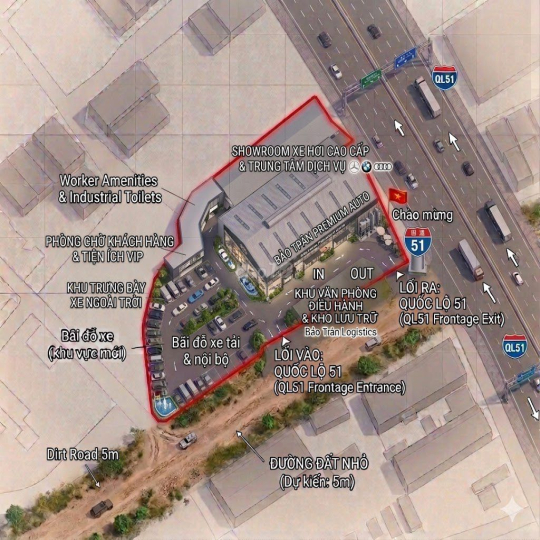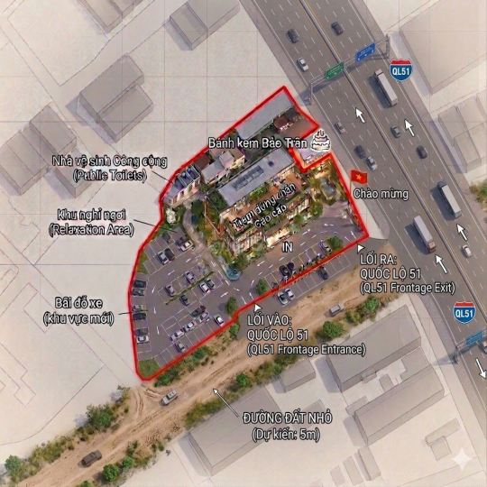 Địa thế: Lô đất 2 mặt tiền (Mặt tiền QL51 và đường hông 145m), xe lớn ra vào cực kỳ thuận tiện.