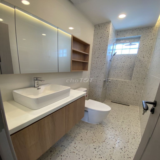 Nội thất phòng vệ sinh hiện đại mới, có tủ gương rộng để mỹ phẩm và các vật dụng khác, có thể tủ lavabo tăng không gian để đồ giúp phòng gọn gàng sạch sẽ.