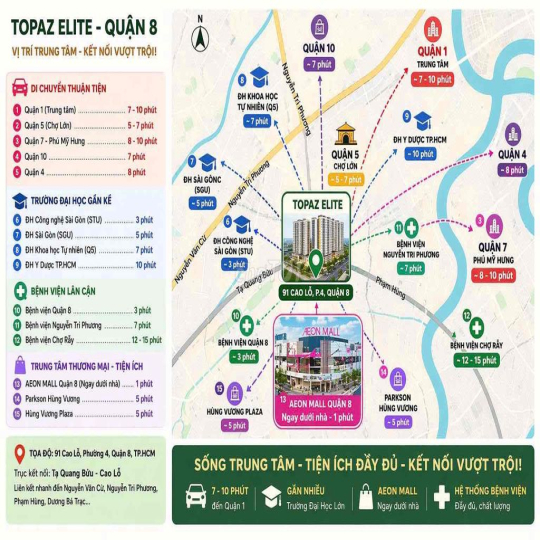 Nằm gần cầu chữ Y tiện di chuyển qua Q1, Q5, Q10, Q7... thoải mái không lo kẹt xe, ngập nước.